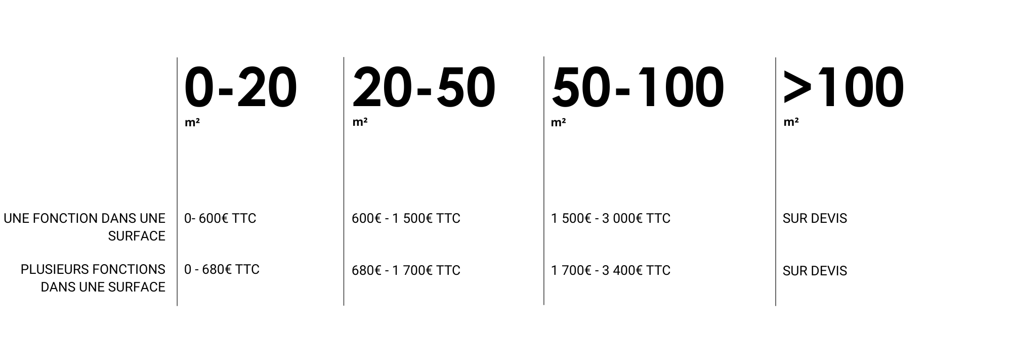 Dans la grille tarifaire ci-dessous, le premier déplacement sur site pour la prise de mesures est gratuit, à condition que la distance ne dépasse pas 30 km autour du centre de Nantes ou d’Angers. Tout déplacement supplémentaire sera facturé selon le nombre de kilomètres parcourus.
